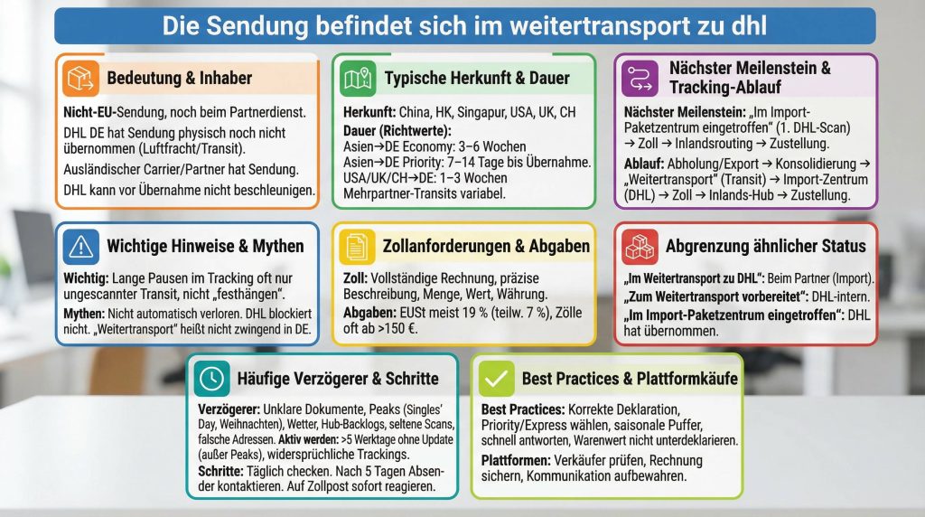 Kurzfassung: Dein Paket reist international (oft per Luftfracht) und wird von einem Partnerdienst Richtung Deutschland befördert. DHL übernimmt erst nach Ankunft im Land – davor verharrt die Anzeige im Status „Weitertransport zu DHL“.