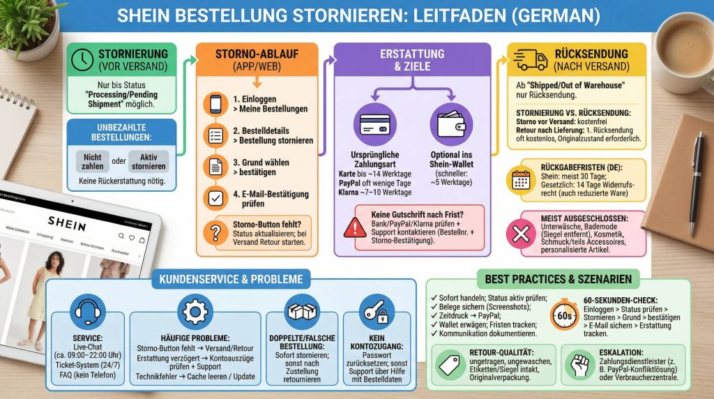 Wenn du deine Shein Bestellung stornieren willst, zählt vor allem eins: Geschwindigkeit. Eine Stornierung ist nur möglich, solange die Bestellung noch nicht versendet wurde. In diesem Leitfaden erfährst du kompakt und detailliert, welche Voraussetzungen gelten, wie du in der App oder am Desktop korrekt vorgehst, wie Rückerstattungen funktionieren, welche Ausnahmen zu beachten sind und welche Verbraucherrechte dir in Deutschland zustehen. Außerdem findest du Lösungen für die häufigsten Probleme, konkrete Kontaktwege zum Kundenservice und praxiserprobte Tipps.