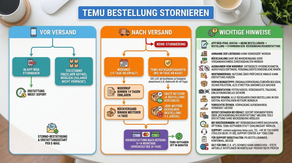 Ist die Bestellung unterwegs oder bereits zugestellt, kannst Du sie nicht mehr „stornieren“. Stattdessen nutzt Du das gesetzliche Widerrufsrecht (14 Tage ab Erhalt) oder die Temu-Rückgabegarantie (bis zu 90 Tage ab Kauf).